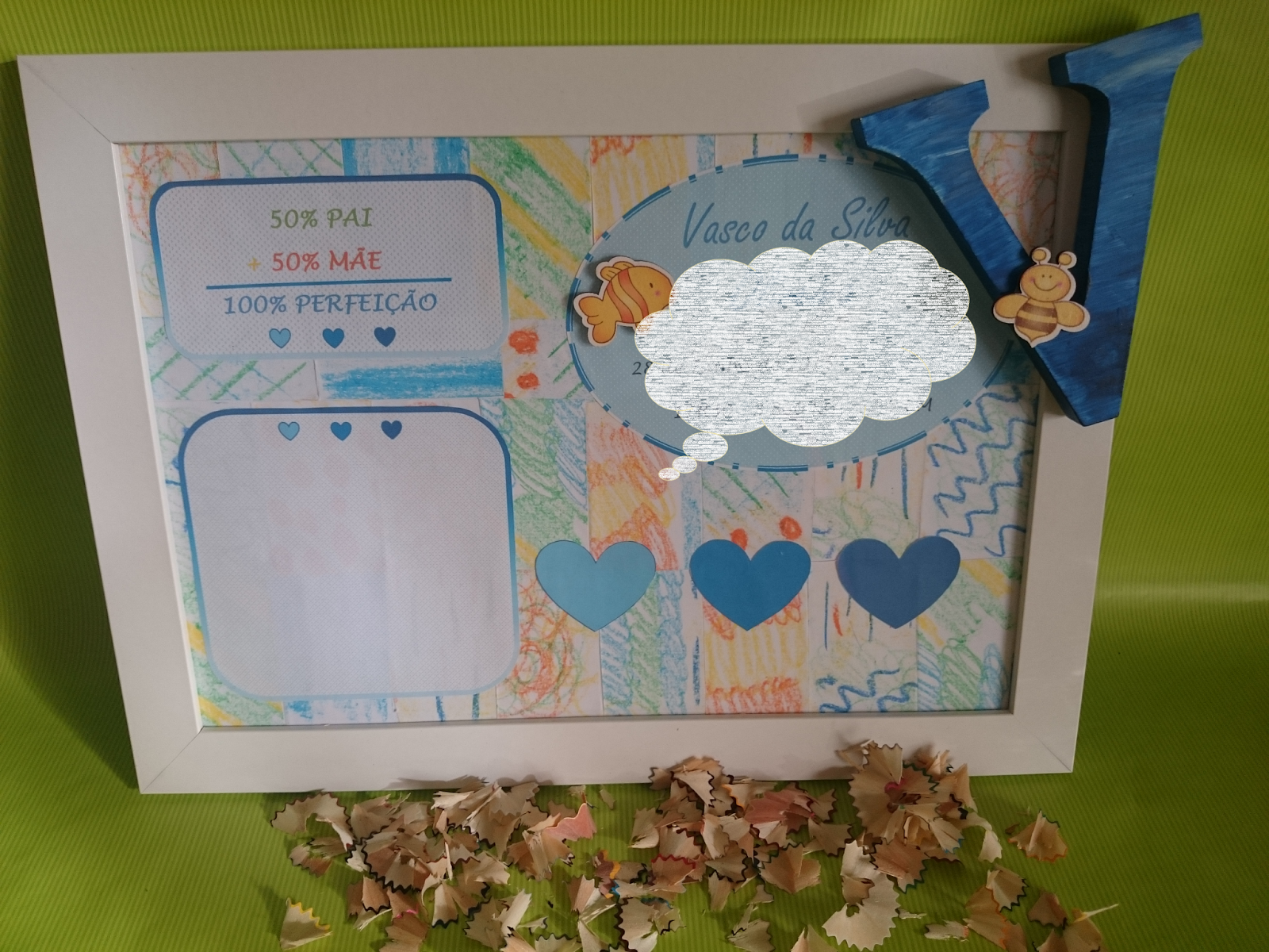 No espaço que vês em branco coloquei uma foto mas também fica giro se for feita a impressão da mão e/ou pé do bebé com tintas apropriadas. E desta forma envolvem-se os pais e o bebé na atividade.